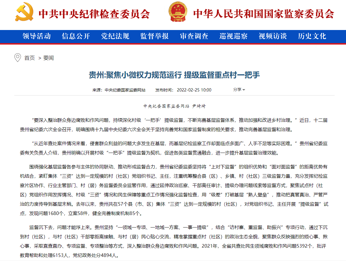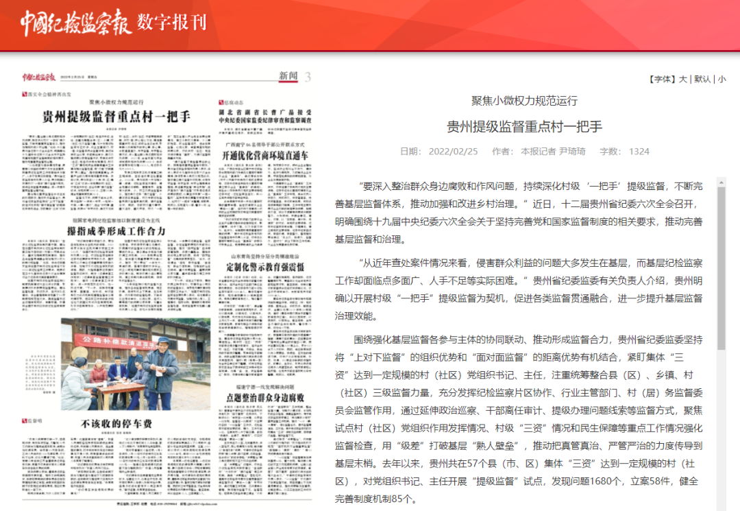 《中国纪检监察报》新闻版头条、中央纪委国家监委网站:聚焦小微权力规范运行 贵州提级监督重点村一把手