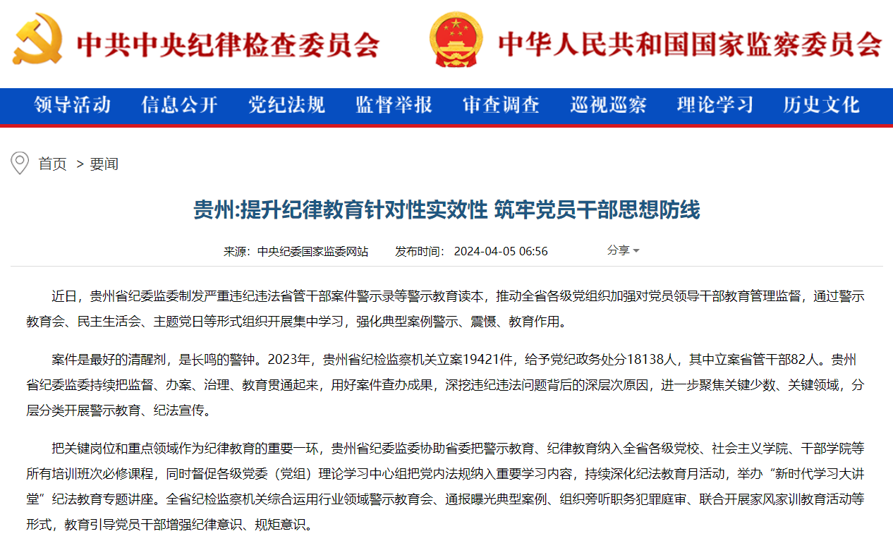 《中国纪检监察报》、中央纪委国家监委网站| 贵州提升纪律教育针对性实效性 筑牢党员干部思想防线