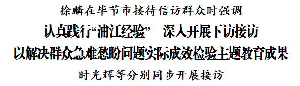 “浦江经验”是习近平总书记亲自倡导并带头下去接访群众形成的好经验、好做法。在深入开展主题教育中,省委坚持把学习践行“浦江经验”作为重要内容,着力推动解决基层群众急难愁盼问题。在毕节市信访局接访大厅,徐麟先后接待了4批来访群众,耐心听取他们反映受灾群众安置补偿、煤矿手续办理、土地征用及出让、拖欠农民工工资等问题,关切询问具体情况,与有关方面负责同志现场商定解决方案,来访群众均表示满意。他要求相关地方及部门明确具体方案,采取有力措施,设身处地为群众着想,确保群众反映的问题尽快解决到位。要坚持举一反三,强化系统治理,从源头上彻底解决类似问题。