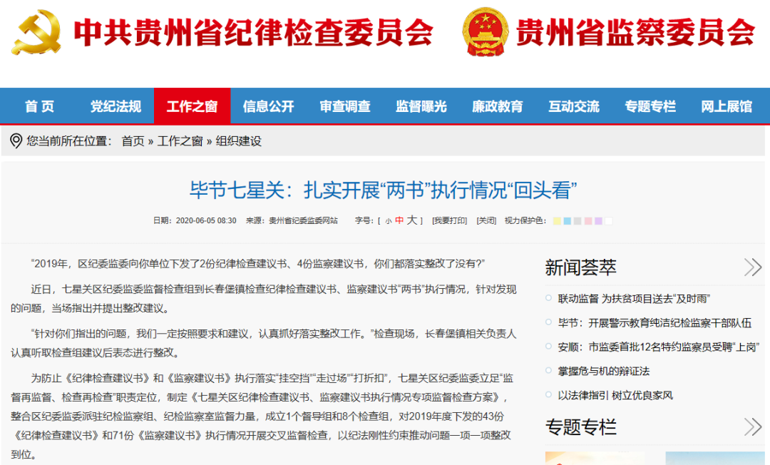 近日,七星关区纪委监委监督检查组到长春堡镇检查纪律检查建议书、监察建议书“两书”执行情况,针对发现的问题,当场指出并提出整改建议。