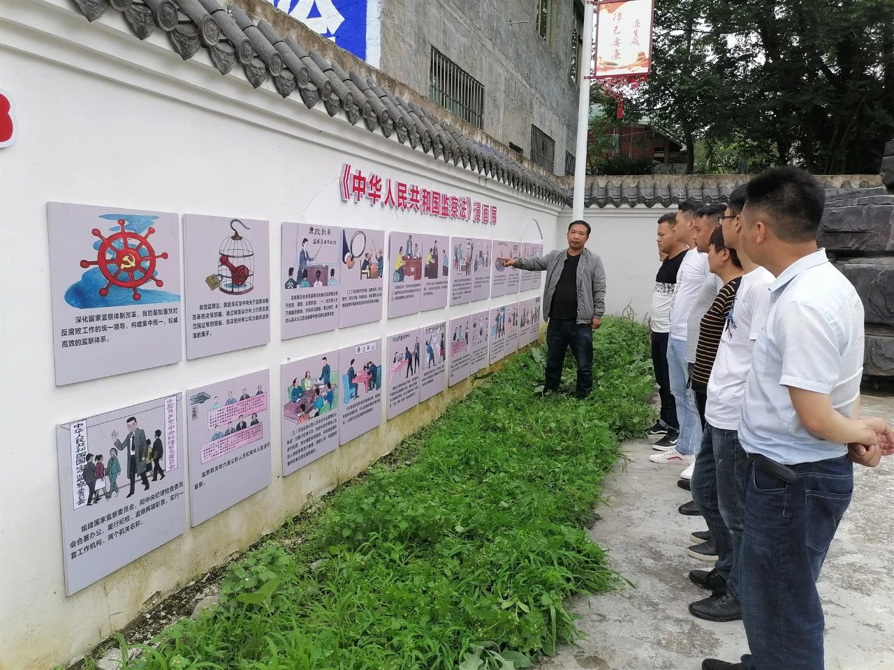 百里杜鹃大水乡纪委精选廉政警句、小故事、廉政漫画及发生在群众身边的腐败案例绘制文化墙,将廉政文化宣传教育触角向社区延伸、向纵深做实。图为百里杜鹃大水乡乡村干部参观大水乡后坝社区廉政文化示范点(百里杜鹃纪检监察工委供 王晗煜 摄)