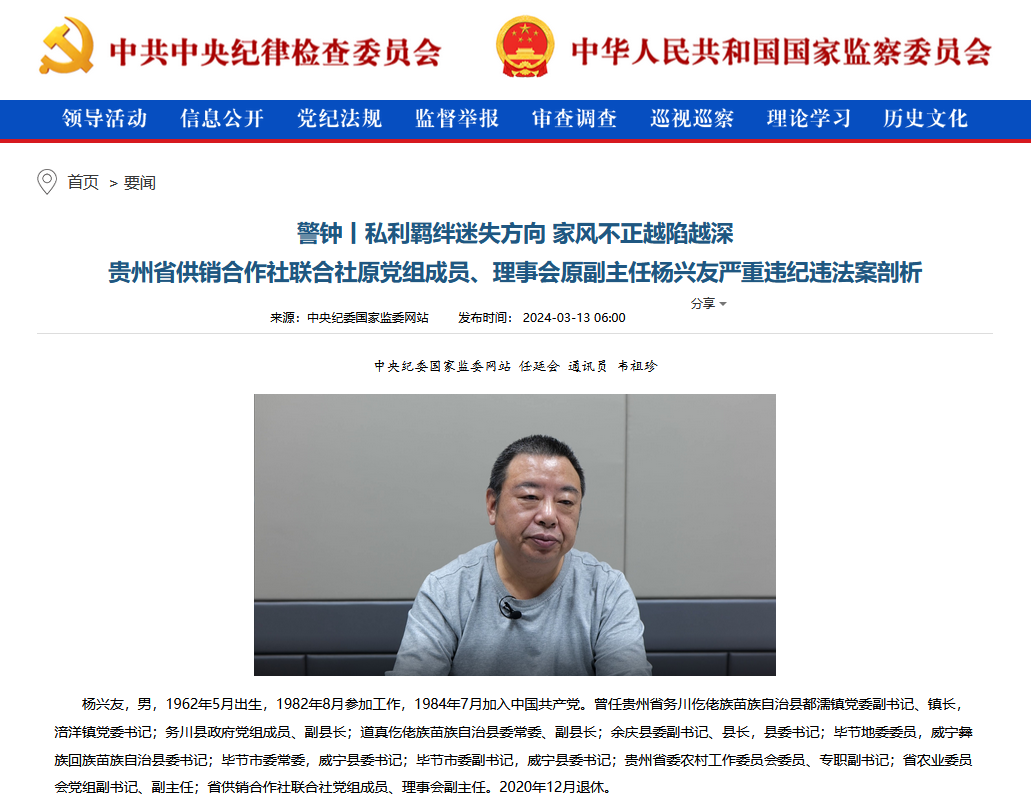 以案示警丨私利羁绊迷失方向 家风不正越陷越深 贵州省供销合作社联合社原党组成员、理事会原副主任杨兴友严重违纪违法案剖析