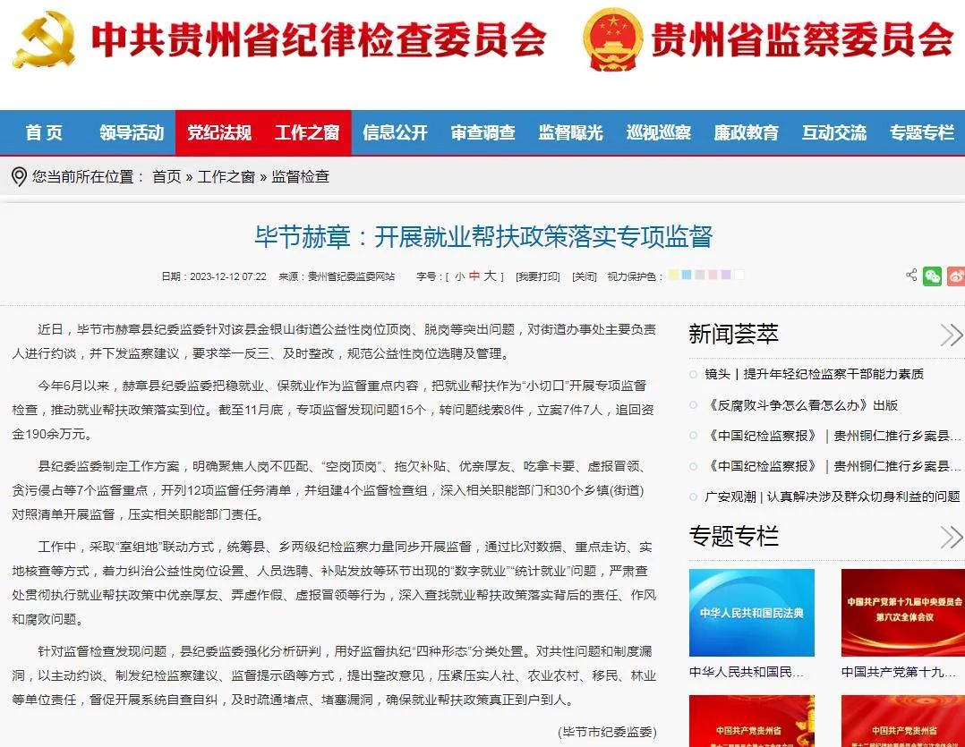 贵州省纪委监委网站 | 毕节赫章:开展就业帮扶政策落实专项监督