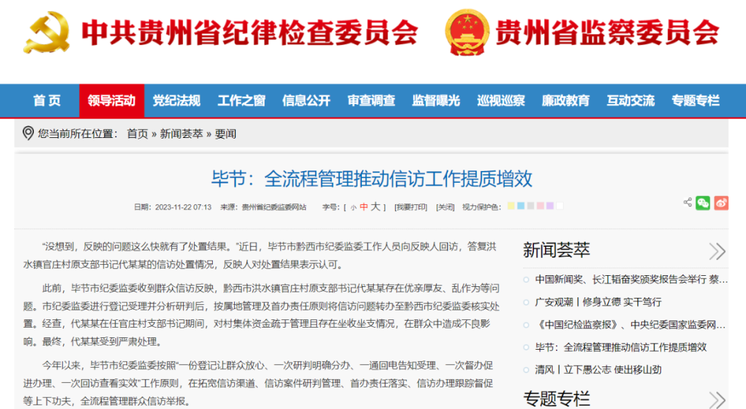 贵州省纪委监委网站 |毕节:全流程管理推动信访工作提质增效