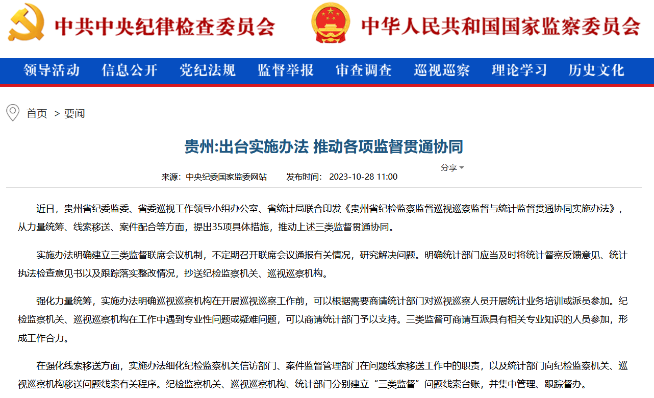 近日,贵州省纪委监委、省委巡视工作领导小组办公室、省统计局联合印发《贵州省纪检监察监督巡视巡察监督与统计监督贯通协同实施办法》,从力量统筹、线索移送、案件配合等方面,提出35项具体措施,推动上述三类监督贯通协同。