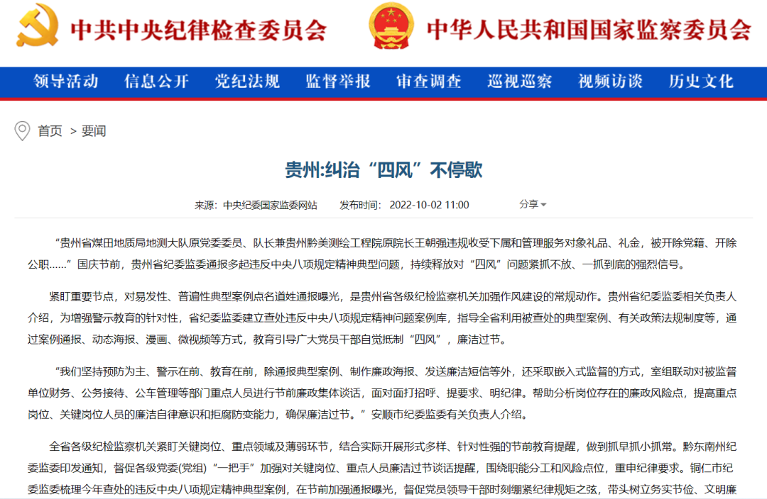 “贵州省煤田地质局地测大队原党委委员、队长兼贵州黔美测绘工程院原院长王朝强违规收受下属和管理服务对象礼品、礼金,被开除党籍、开除公职……”国庆节前,贵州省纪委监委通报多起违反中央八项规定精神典型问题,持续释放对“四风”问题紧抓不放、一抓到底的强烈信号。