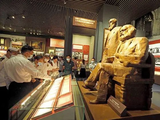 中国共产党历史展览馆内,观众在玻璃展柜中陈列的马克思手稿前驻足凝望。