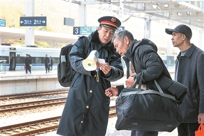 春节假期,万家团圆,许多劳动者坚守在岗位上,默默奉献。近日,国铁南昌局宁德站客运员张鹏昌在站台为旅客服务。 新华社发(王勇富 摄)