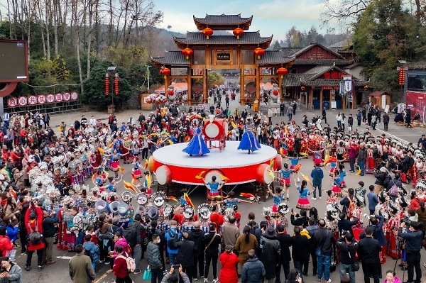 在贵州省铜仁市松桃苗族自治县苗王城景区,舞者为春节期间慕名而来的游客表演花鼓舞,人们在非遗贺新春活动中乐享喜庆祥和的中国年。(贵州省铜仁市松桃苗族自治县纪委监委供 陈安富 摄)