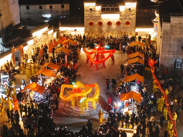 新春期间,皖南小城的夜市热闹非凡,人们走向集市,或观看精彩的舞龙灯表演,或在各式摊点前选购物品,小小的集市里弥漫着浓浓的年味。(安徽省宣城市广德市纪委监委供 易成 摄)