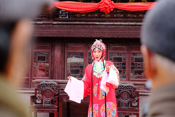 在江苏省苏州市姑苏区桃花坞唐寅故居文化区,年味浓厚的非遗游园会正在上演,游客欢聚古城,共度蛇年新春。图为市民游客在观赏传统戏剧非遗项目。(江苏省苏州市姑苏区纪委监委供 陈哲 摄)