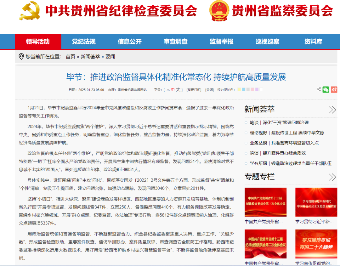 贵州省纪委监委网站|毕节:推进政治监督具体化精准化常态化 持续护航高质量发展