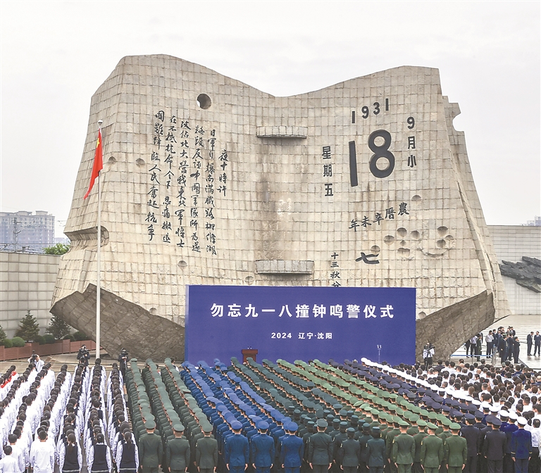 9月18日,勿忘“九一八”撞钟鸣警仪式在辽宁省沈阳市“九·一八”历史博物馆残历碑广场举行。