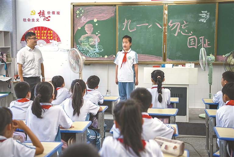 9月18日,安徽省芜湖市繁昌区繁阳镇城关一小举办“铭记历史 勿忘国耻”主题班会。 图片来源:视觉中国