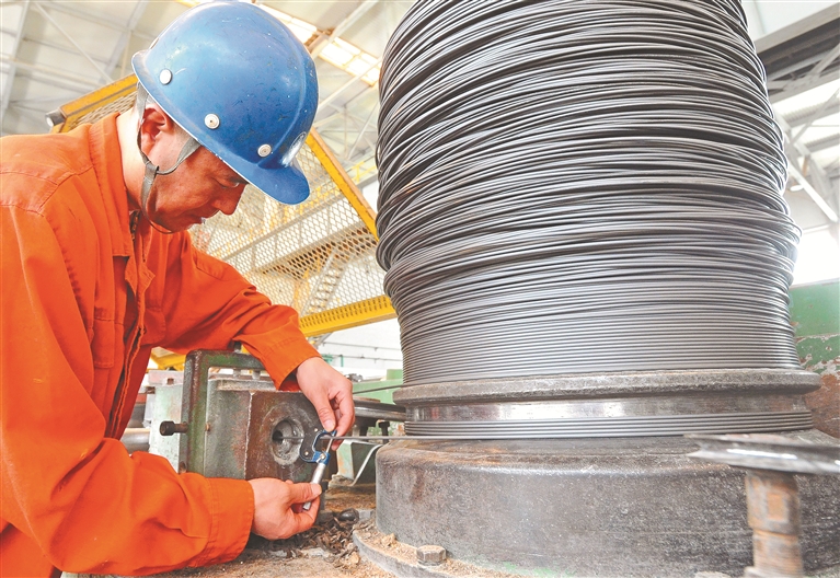 辽宁省大连市,一家企业钢丝车间的拔丝工在直进式拉丝机前检查拉拔钢丝尺寸精度。