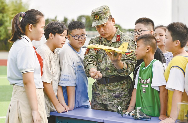 9月6日,在安徽省合肥市古城小学,该市庐阳区民兵用武器装备模型向学生介绍装备性能。图片来源:视觉中国