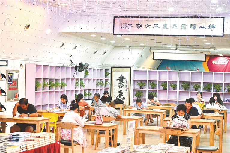 文化在阅读中不断传承。从城市到乡村,从校园到公园,从商场到街道,阅读越来越成为一道亮丽的风景线。炎炎夏日,图书馆、图书商城成为市民消暑读书好去处。图为市民在福建省福州市越洋图书城读书角品书香,纳清凉。 新华社记者 姜克红 摄