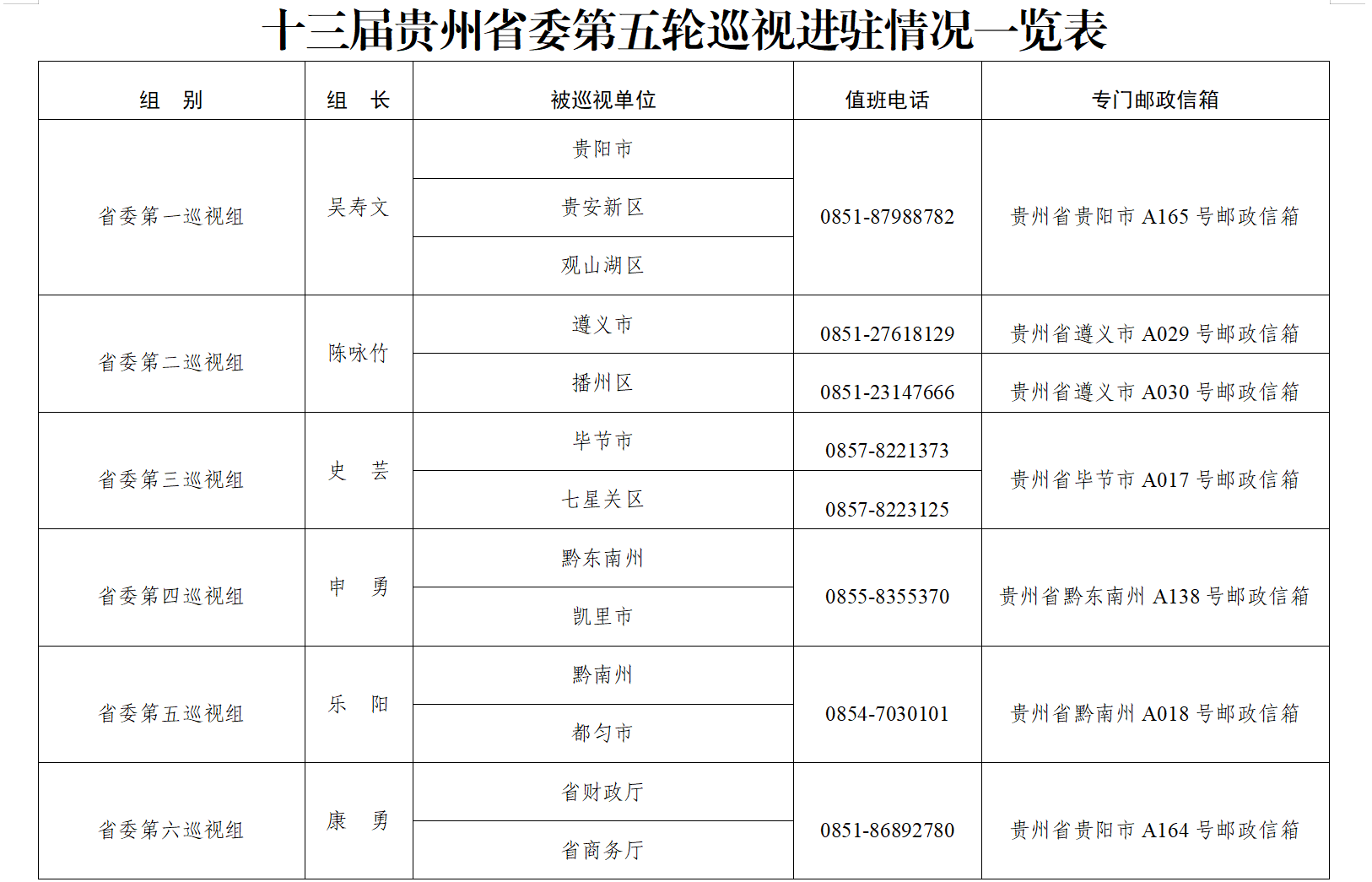 根据贵州省委关于巡视工作的统一部署,截至7月9日,十三届省委第五轮巡视完成进驻工作,12个省委巡视组对贵阳市(贵安新区)、遵义市、毕节市、黔东南州、黔南州、观山湖区、播州区、七星关区、凯里市、都匀市、省发展改革委党组(延伸巡视省综合交通和区域经济发展中心党组)、省工业和信息化厅党组、省财政厅党组、省住房城乡建设厅党组、省交通运输厅党委、省商务厅党组、省文化和旅游厅党组、省能源局党组、省广电局党组、省大数据局党组、省林业局党组、省投资促进局党组、省信息中心党委、省公路局党委等25个党组织开展常规巡视(延伸巡视1个对象)。