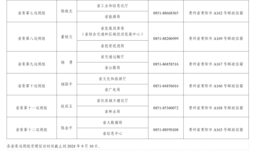 巡视期间,各省委巡视组设立专门值班电话和邮政信箱,主要受理反映被巡视党组织领导班子及其成员、下一级党组织领导班子主要负责人问题的来信来电来访,重点是关于违反政治纪律、组织纪律、廉洁纪律、群众纪律、工作纪律和生活纪律等方面的举报和反映,其他不属于巡视受理范围的信访问题,将按规定由被巡视单位和有关部门认真处理。巡视组受理信访时间截至2024年9月10日。