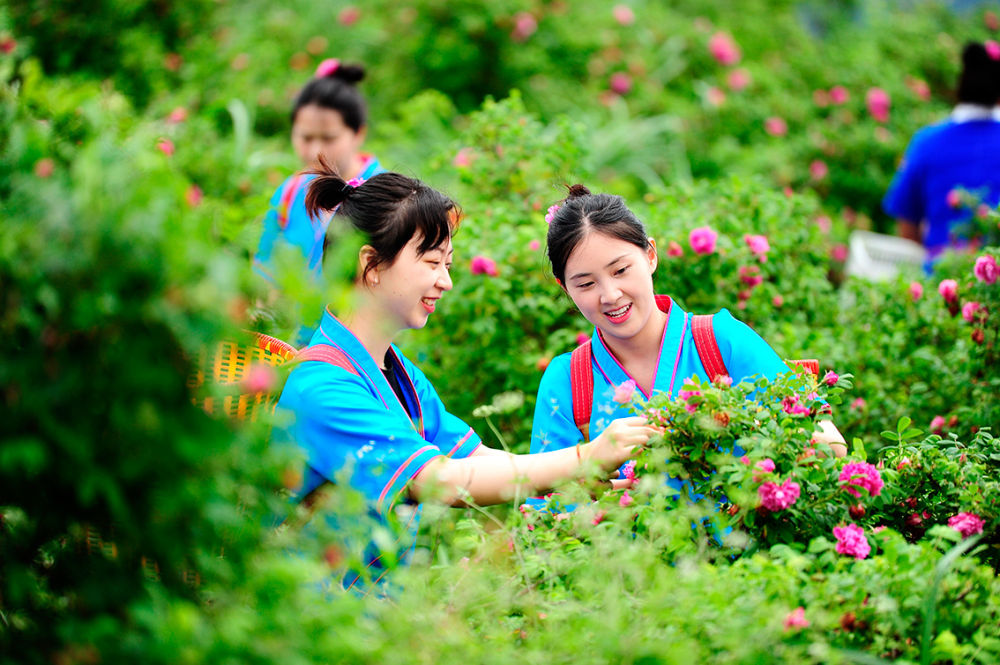 黔东南苗族侗族自治州黄平县新州镇发展“美丽经济”,助力乡村振兴。图为五里墩村玫瑰花基地采收场景。潘锋/摄