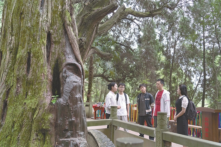 四川省剑阁县翠云廊有迄今保存最完好的古代人工栽植驿道古柏群,当地通过“一树一档”挂牌保护、“一树一人”日常巡护、“一树一策”科学救护等措施,守住青绿苍翠。图为近日,游客在观看翠云廊古柏群。 图片来源:视觉中国