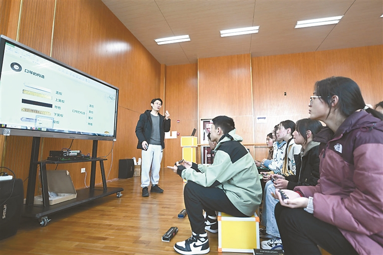 上海援青教师在果洛西宁民族中学给学生上音乐课。(资料图片)