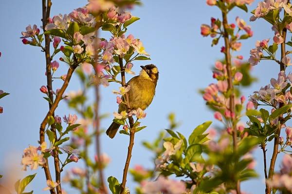 海棠弄春垂紫丝,一枝立鸟压花低。(河南省漯河市源汇区纪委监委供 尤亚辉 摄)
