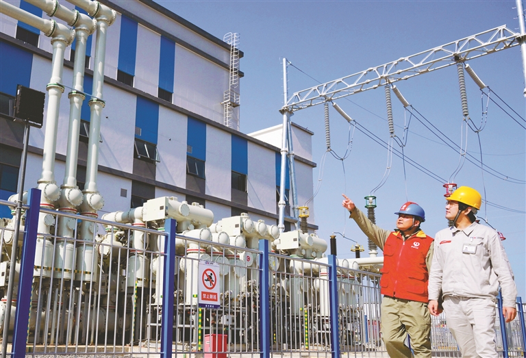 4月9日,300兆瓦级压缩空气储能电站示范工程在湖北省应城市正式并网发电。图为当日储能电站操作人员在巡视电力设备。 新华社记者 程敏 摄