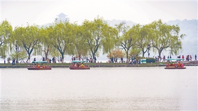 春日的杭州西溪国家湿地公园生机勃勃,草翠水绕,公园内生态资源丰富、自然景观幽雅、文化积淀深厚。图为游客乘船游览西溪国家湿地公园,乐享清明假期。