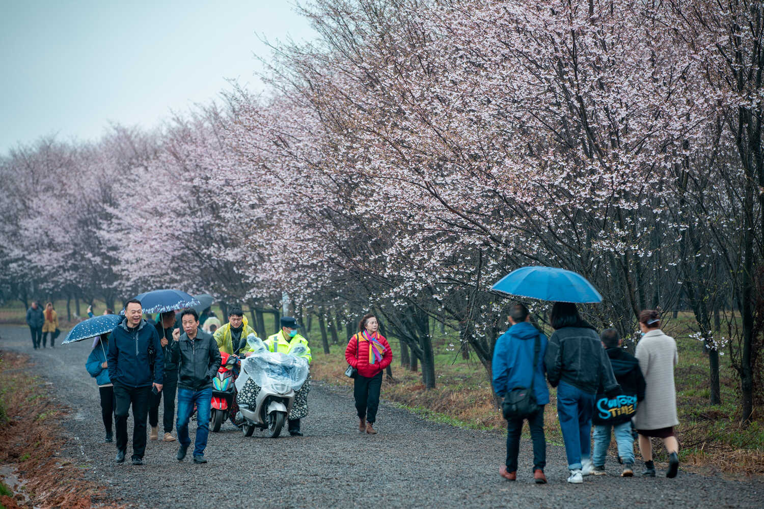 细雨微斜,惠风拂面。纷纷微雨也挡不住人们出游的热情,三三两两的游人行走在微湿的小径上,在杏花微雨中寻找最美春色。(安徽省宣城市广德市纪委监委供 胡六青 摄)