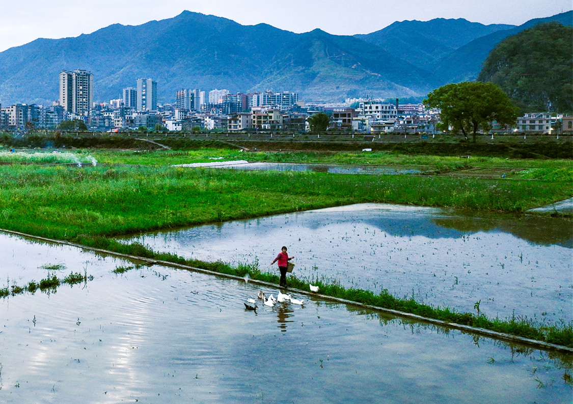 清明时节,天清气明,广东省连南瑶族自治县三江镇的田野上草木菁菁,农户赶着三五鸭子在田间觅食,春光明媚如画。(广东省清远市连南瑶族自治县纪委监委供 盘晓云 摄)