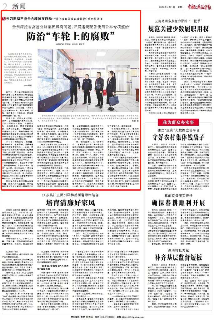 《中国纪检监察报》“新闻”版头条、中央纪委国家监委网站|贵州深挖省高速公路集团风腐问题,开展违规配备使用公车专项整治 防治“车轮上的腐败”