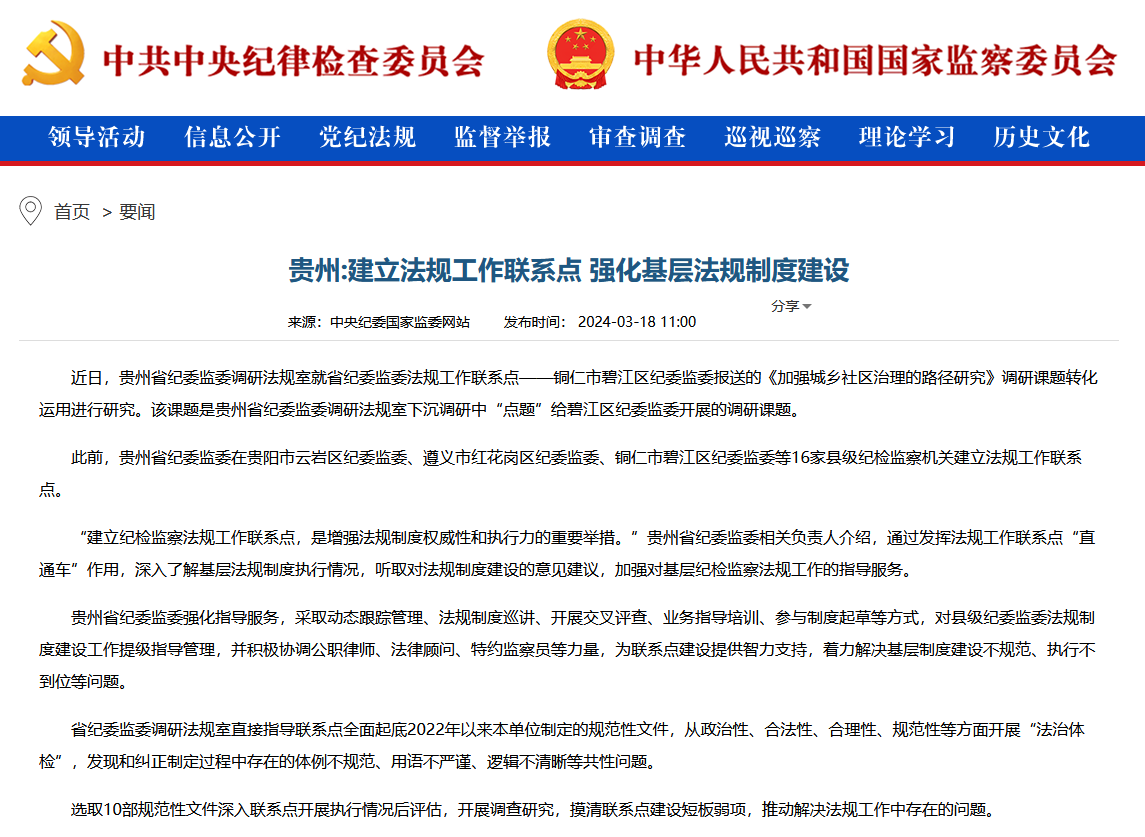 中央纪委国家监委网站 | 贵州:建立法规工作联系点 强化基层法规制度建设