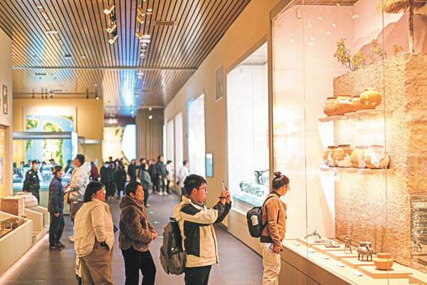 近日,殷墟博物馆新馆开馆。青铜器、陶器、甲骨、玉器等近4000件套文物在该馆集中公开展示,展陈文物数量之庞大、类型之齐全,都是商代文物展览之最,展现了一幅恢宏壮阔的中华早期文明画卷。图为观众在该馆参观。 图片来源:视觉中国
