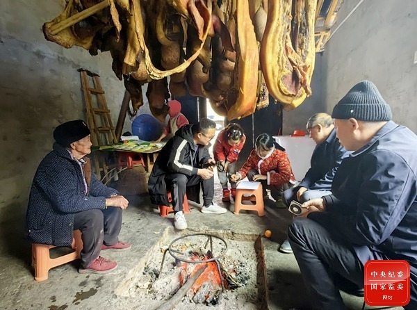 贵州省罗甸县纪检监察机关组织监督力量进村入户开展精准监督,推动解决群众的困难和诉求,让群众舒心过冬。图为纪检监察干部在逢亭镇翁传村群众家中走访交流。(贵州省罗甸县纪委监委 陆金剑 摄)