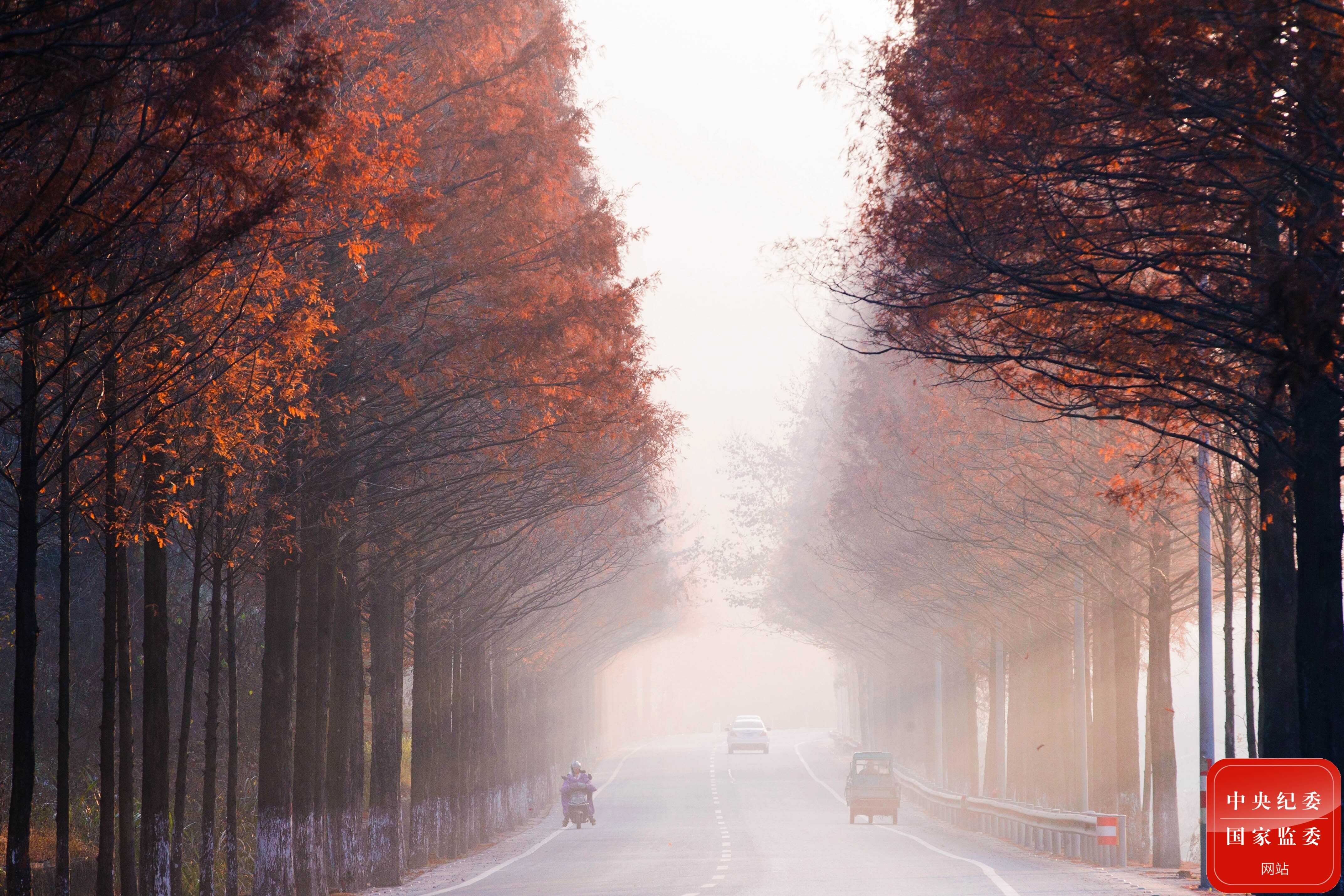 冬至时节,浙江省永康市舟山镇临石线又迎来了一年中最美的时候,沿途的水杉换上了橘红色的“冬装”,阳光从树梢间穿过,缓缓演绎着一场光与影的交织。(浙江省永康市纪委监委供 朱李刚 摄)