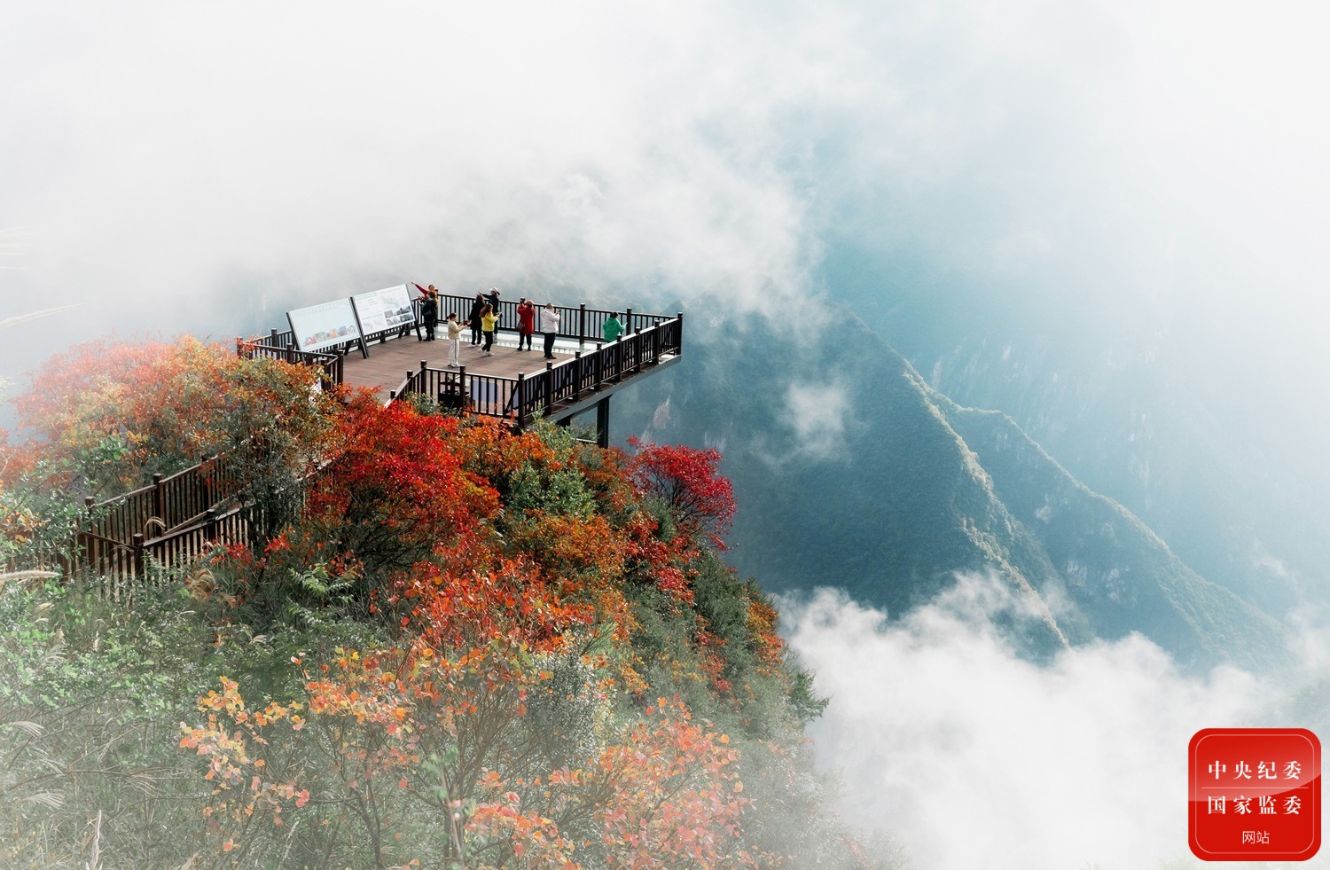 冬至时节,薄雾中的重庆市巫溪县兰英大峡谷红叶漫山,引得游人纷纷前来登山远望,用镜头记录下斑斓色彩。(重庆市巫溪县纪委监委供 董晏 摄)