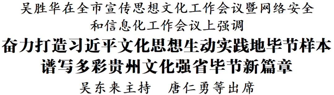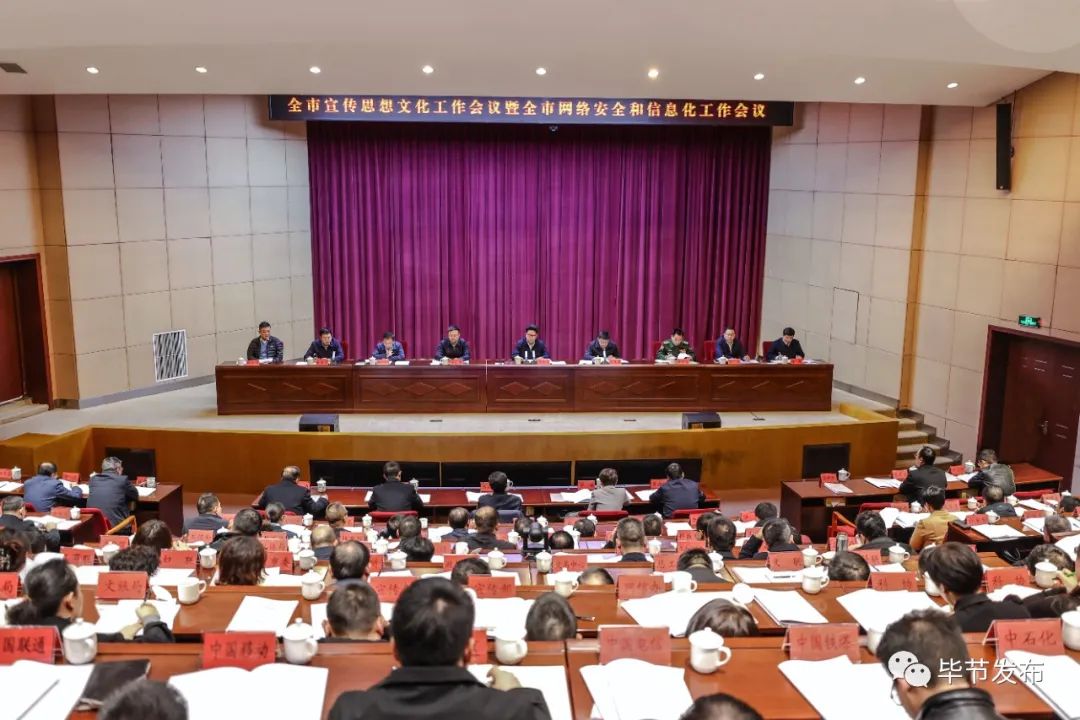 12月21日,全市宣传思想文化工作会议暨网络安全和信息化工作会议在七星关召开。市委书记、市委网信委主任吴胜华出席会议并讲话。他强调,要深入学习贯彻习近平文化思想和习近平总书记关于网络强国的重要思想,全面贯彻落实全国、全省宣传思想文化工作会议及网络安全和信息化工作会议精神,聚焦首要政治任务,围绕新的文化使命,举旗帜、聚民心、育新人、兴文化、展形象,奋力打造习近平文化思想生动实践地毕节样本,谱写多彩贵州文化强省毕节新篇章。