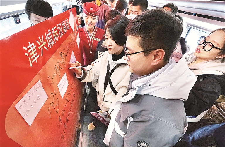 12月18日,津兴城际铁路开通运营。乘坐首趟G8842次列车的旅客进行签字打卡留念。图片来源:视觉中国