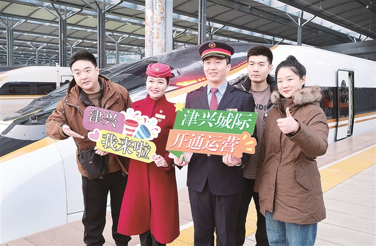12月18日,津兴城际铁路开通运营。乘务人员与旅客在天津西站站台合影留念。图片来源:视觉中国