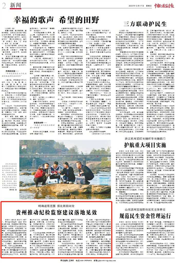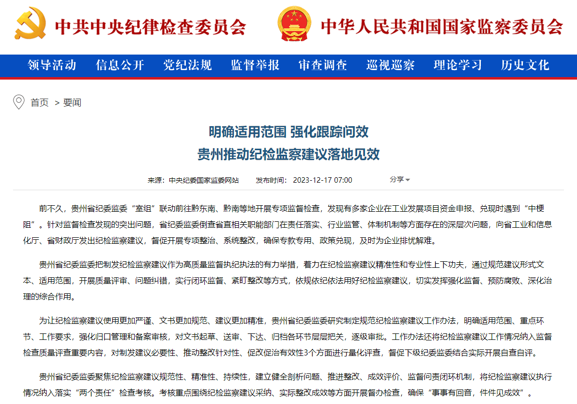 《中国纪检监察报》、中央纪委国家监委网站| 明确适用范围 强化跟踪问效 贵州推动纪检监察建议落地见效