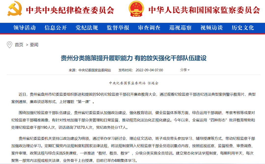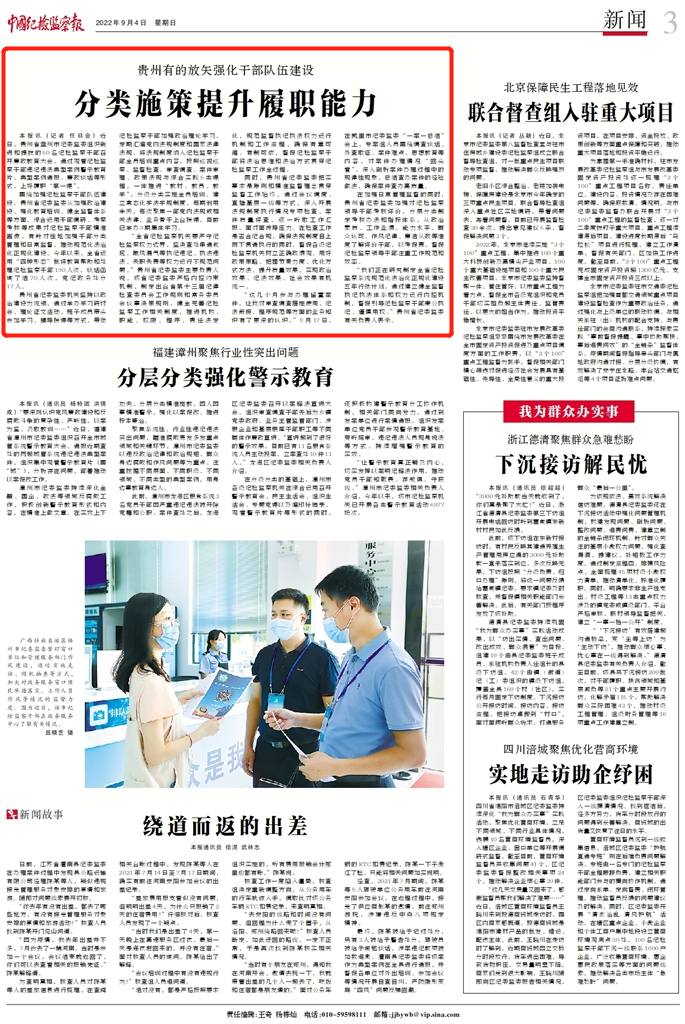 《中国纪检监察报》“新闻”版头条、中央纪委国家监委网站| 贵州有的放矢强化干部队伍建设 分类施策提升履职能力