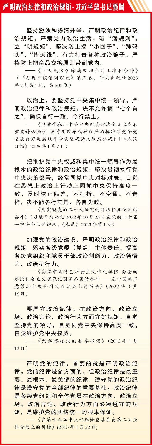 严明党的纪律,尤其是政治纪律,是我们党的光荣传统。习近平总书记强调政治纪律是最重要、最根本、最关键的纪律,遵守党的政治纪律是遵守党的全部纪律的重要基础。新时代新征程上,必须更加自觉遵守政治纪律和政治规矩,听从党中央指挥,始终向党中央看齐,同党中央要求对标对表,及时校正偏差,坚决保障党中央决策部署落实到位。