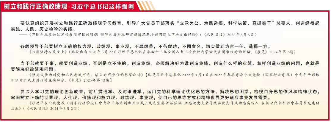 今年是“十五五”开局之年,顺利完成“十五五”时期目标任务,要树立和践行正确政绩观。1月20日,在省部级主要领导干部学习贯彻党的二十届四中全会精神专题研讨班开班式上,习近平总书记阐明了新征程上树立和践行正确政绩观的重要意义:“‘十五五’开局之年,无论是制定规划还是部署实施,都需要有正确的政绩观。省市县乡领导班子将陆续换届,强调政绩观也很有针对性。”今年2月,习近平总书记在北京考察时,再次强调:“‘十五五’已经开局起步,各级领导班子热情高、干劲足,这是好的,关键是政绩观一定要对头。要引导党员干部特别是领导干部深刻认识树立和践行正确政绩观对于党和国家事业发展、党的建设的重要性,深入查找和纠治政绩观偏差,努力创造经得起实践、人民、历史检验的实绩。”