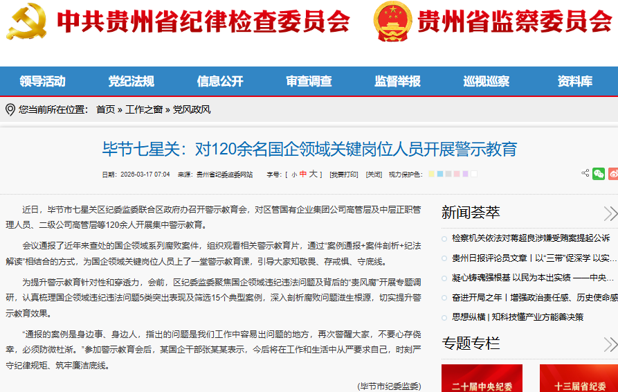 贵州省纪委监委网站丨毕节七星关:对120余名国企领域关键岗位人员开展警示教育